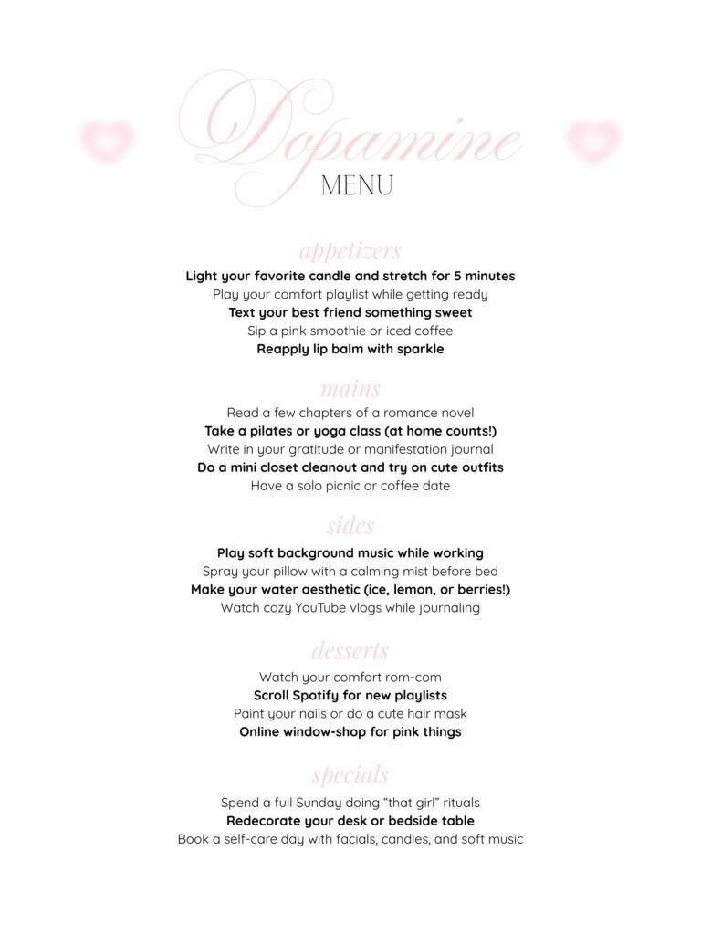 I first saw a reference to dopamine menus on Instagram, even though it started as a Tiktok trend. I remember it was on Poosh, and it took me a minute to understand what in the world they were talking about! So if you’re right now on that same boat, let me walk you through what I’ve learned about this idea, and how I fell in love with it almost instantly.